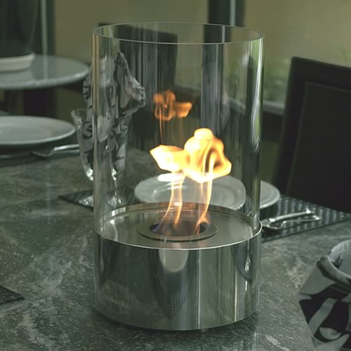 The perfect accent to any table, in any setting. This portable tabletop fireplace features a polished stainless steel base and stunning tempered glass cylinder encasing the flames. Accenda tabletop bio-fireplace may be used indoors or out, however do not leave your fireplace outside exposed to the elements after use. Ships with snuffer. Fuel not included, we recommend using Nu-Flame Bio-Ethanol Fuel.