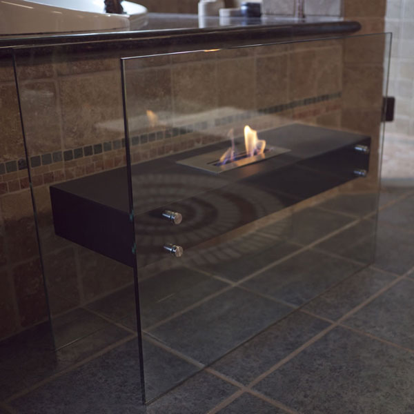 La Strada features a large capacity stainless steel burner and sleek black body suspended between two thick tempered glass panels which reflect and enhance the fire.